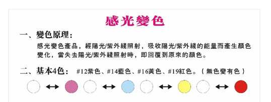2、應(yīng)避免感光變色粉與紫外光吸收劑同時使用。