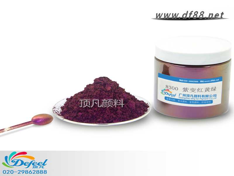 8300 紫變紅黃綠變色龍粉可應用于涂料、油墨、塑料各產業,產品之設計大多以室內(無紫外光之環境)與室外(有紫外光之環境)有顏色變化為訴求。