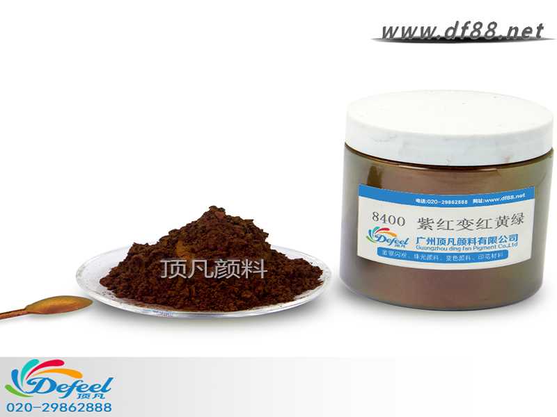 8400 紫紅變紅黃綠變色龍粉可應用于涂料、油墨、塑料各產業,產品之設計大多以室內(無紫外光之環境)與室外(有紫外光之環境)有顏色變化為訴求。